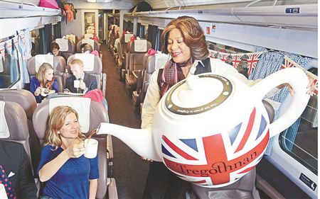 近日在英国,一把印着特里格斯南郡的巨型茶壶亮相列车,为乘坐列车的上班族们提供饮品。
