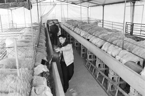 山东省梁山县拳铺镇后张村农民张建国在梁山县农村信用合作联社的资金扶持下,投资100万元建起了养殖场,成立了养殖合作社,能容纳小尾寒羊、波尔山羊400多只,羊舍离地面1.5米高,减少了疾病发生的可能性,平时喂养氨化草饲料,加强防疫,饲养的优质小尾寒羊销往辽宁、黑龙江、甘肃等全国10多个省市,成为当地发家致富的好门路。图为张建国喂养小尾寒羊。