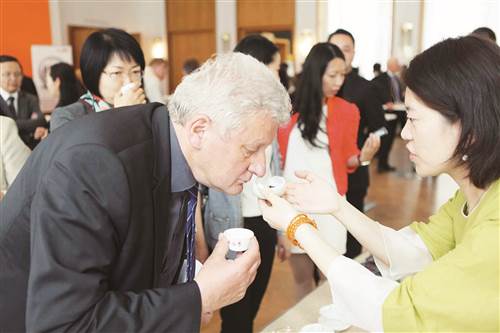 5月18日—24日,“柏林亚太周——感知中国”活动在德国首都柏林举办。由北京市政府新闻办和东城区共同主办的“地坛文化庙会”成为柏林亚太周最大亮点。图为宾客在活动中品味茉莉花茶。韩 旭 摄