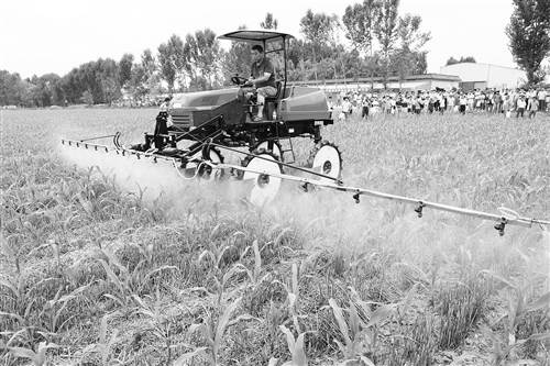 7月3日,在河南省博爱县原种场,农用植保飞行器在做喷洒农药演示。当天,焦作市农机推广站举办植保机械演示活动,全市农机推广系统、农业植保系统、农机专业合作社、家庭农场、种粮大户现场观看了植保机械演示。