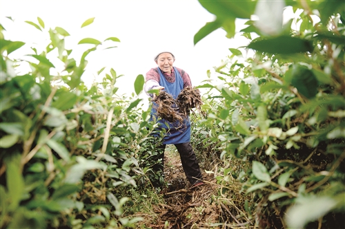 贵州省遵义市凤冈县娄山春茶叶专业合作社,在管护茶园的过程中始终坚持绿色理念,杜绝使用农药和化肥,采用传统的农耕模式为茶园松土、除草、施肥,从而有效保证了茶园和茶叶的有机品质。图中,凤冈县娄山春茶叶合作社社员于近日,给茶园施牛屎粪。