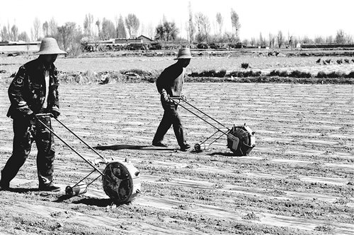 甘肃张掖是全国最大的市级制种玉米基地,年产优质杂交玉米种子4.5亿公斤,占全国大田玉米年用种量的40%以上,可满足全国2亿多亩大田玉米生产用种。图为东三村村民在用玉米点穴机点播制种玉米。