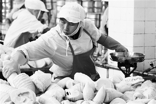 图为江西省遂川县罗霄山罐头食品有限公司工人们正在分拣春笋装罐出口。
