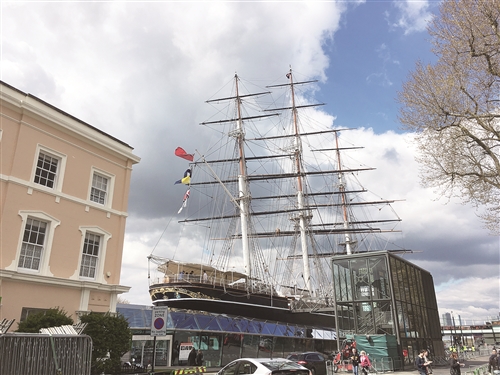 离开国家海事博物馆,团员们紧接着参观和国家海事博物馆相邻的卡蒂萨克飞剪船。其又名“短衬衫”号飞剪船,建于1869年,长64米,宽11米,甲板上的桅杆高度达46.3米,是一艘铁木合构船。它的船帆全部挂满时达32000平方英尺,相当于11个网球场。