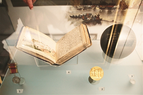 馆长指向一旁的陈列柜,里面的笔记本里记载一位英国随军医生的战争日记,还有一发中国向英国舰队发射的炮弹,以及一枚参与鸦片战争的军人的徽章。这些展品,安静地躺在博物馆里,向参观者讲述着硝烟迭起的回忆。