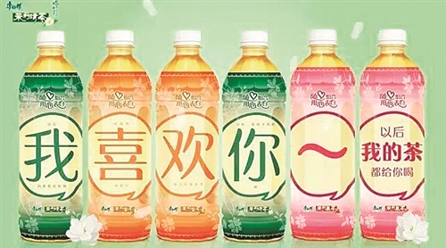 康师傅最近要出“表白瓶”,有三个系列,消费者买全三个系列就可以拼出一段表白语:“我喜欢你~以后我的茶都给你喝。”