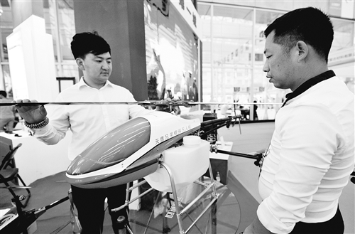 图为农业植保无人直升机降落展馆。