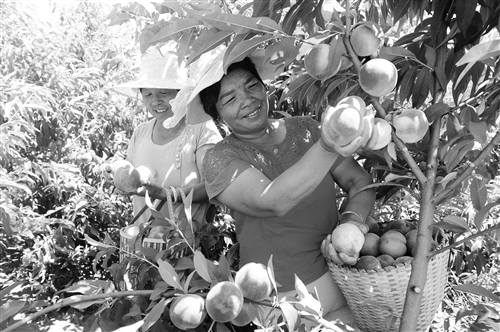 6月17日,安徽省阜阳市颍泉区绿之林种养专业合作社组织社员和农户在桃园内喜摘丰收的“音乐桃”,经过分拣包装后,直接销售到本地农产品批发市场和外地市场。据了解,该专业合作社对栽培桃树从开花到挂果,采取“听音乐”“喝牛奶”“吃有机肥”的生态培育管理模式,成熟的桃子不仅色泽好,而且口感纯正,一上市便成为抢手货。王彪 摄(cnsphoto 供图)