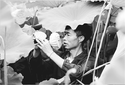 江西万年县苏桥乡坂头村村民刘长喜外出务工多年,去年看准市场返乡和村里6位村民共投资近200万元,成立喜荣白莲农民合作社,以每亩租金600元价格,集中连片流转本村及附近村土地300余亩种植太空莲,亩产平均纯收入500多元。图为6月27日喜荣白莲农民合作社农民在采摘莲蓬。