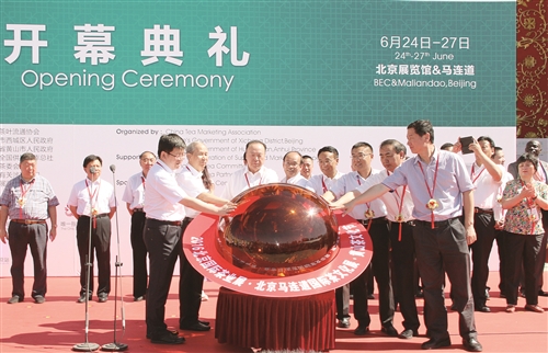 6月24日上午,2016“两展一节”在北京展览馆举行了简约而隆重的开幕仪式。第十届、十一届全国政协副主席白立忱,中华全国供销合作总社党组成员、理事会副主任邹天敬,中国茶叶流通协会会长刘环祥,云南省政协原副主席、农工党中央副主席、云南省茶叶流通协会会长陈勋儒,安徽省农委主任孙正东,中共黄山市委书记任泽锋,中共北京市西城区委书记卢映川,中国茶叶流通协会常务副会长王庆,国家质检总局科技司巡视员裴晓颖,贵州省供销社原主任、中国茶叶流通协会副会长张达伟,北京市商务委副主任闫小彦,贵州省遵义市人民政府副市长田刚等领导,以及来自安徽、贵州、四川、福建、广东等茶叶主产销区的政府、行业组织与企业的代表,国内外茶业界的专家学者、国内外茶叶爱好者,共计300余人出席了开幕式。中共西城区委常委、西城区人民政府副区长王旭主持了开幕式。