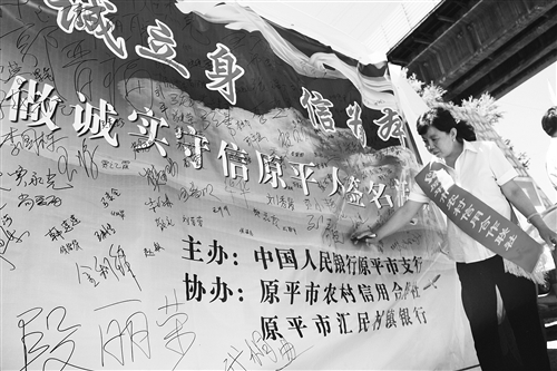 为加强社会信用体系建设,严厉打击失信行为,山西省原平市农村信用合作联社开展“诚立身、信为本”宣传活动,万名市民积极参与,签名承诺做诚实守信市民;设立征信知识宣传咨询台,为市民解说“征信”“个人信用报告”和“信用记录”的涵义;发放宣传折页,普及征信知识,进一步加深民众对征信体系的了解和认识。