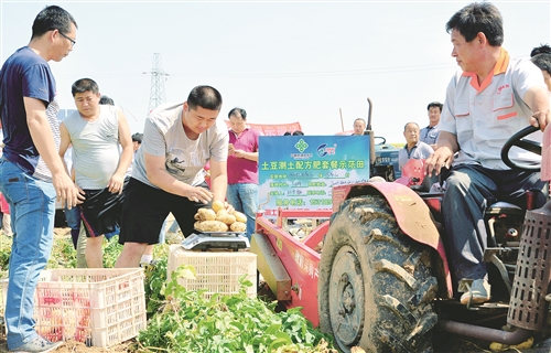 日前,山东省高密市胶河生态农业发展区张家庄供销合作社为农服务中心托管该村农民孙秀梅家的4亩土豆开机收获,经有关人员现场测产,亩产达4522公斤。