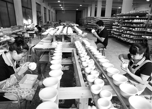 图为7月2日,武义“汉坊婺窑”员工在婺州窑生产线上忙碌。