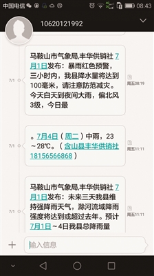 正是看中丰华供销合作社为农服务更接地气的优势,2015年初,安徽省气象局还专门和他们签订合作协议,把他们作为气象监测和预警发布试点平台,帮助气象部门实时上传重点区域实时气象情况,协助他们做好预警发布,做好农业气象服务。这次暴雨期间,农户们就一直能收到气象局和丰华供销合作社联合发布的预警短信。