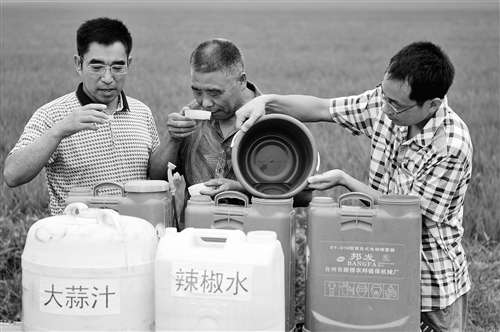 7月11日,在山东省郯城县采莲湖稻麦种植农民专业合作社水稻种植基地里,技术人员用辣椒大蒜水勾兑防治水稻病虫害的喷剂。眼下正是防治水稻病虫害的关键时期,山东省郯城县采莲湖稻麦种植农民专业合作社研发的“辣椒大蒜水预防水稻病虫害”技术首次推广使用。据合作社负责人杨继敏介绍,“辣椒大蒜水”是用熬制的辣椒液和碾碎稀释的大蒜汁勾兑而成,含有大量的杀菌杀虫毒素。使用它喷施水稻既可产出无公害的大米,又能避免使用农药导致的环境污染。