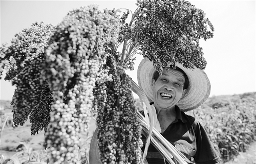 7月16日,四川泸州市江阳区通滩镇开丰村村民在收割订单高粱。近年来,泸州市以“农户+专业合作社+企业”模式,将新农村建设成片推进与企业生产原材料相结合,大力发展规模化有机高粱产业。由当地酿酒企业统一提供种子和技术,生产过程中严格接照不打农药、不打除草剂、不施化肥,实行订单收购,每公斤价格在7.6元至8元之间,比普通种植的高粱价格翻倍,实现了农民增收企业增效。刘学懿 摄(cnsphoto 供图)