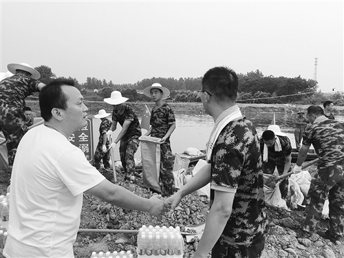7月12日至7月15日,六国化工组织车辆和人员赴安徽枞阳、宿松、望江暴雨受灾区进行慰问,大家为大堤上固坝抢险人员送上一箱箱矿泉水,并赴这几个县的抗洪指挥部捐赠20000多瓶矿泉水。据了解,洪水退后,六国化工还将进一步组织人力物力,帮助受灾地区和民众进行灾后抢种,重建家园。图为六国化工皖南销区指挥李立群带队,给奋战在望江县雷池乡青草湖堤坝上的固坝抢险人员赠送矿泉水。汪晨 摄