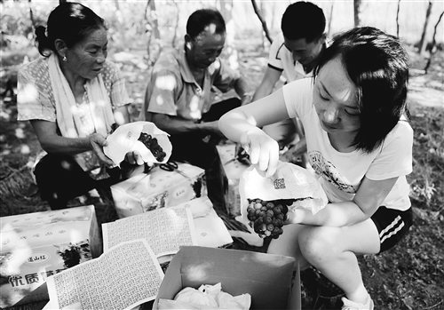 葡萄是江西万年县苏桥乡的传统产业。近年来,该乡成立乡、村葡萄专业合作社,实行统一技术指导、统一采购农资、统一施肥打药、统一品种更新、统一对外销售。在种植管理过程中,合作社全部采用有机、绿色、无公害模式,通过水肥一体化系统将水肥直接送达葡萄藤根部。他们还建立了可追溯机制,通过扫描包装上的二维码便可查询产地、施肥数量、次数等相关信息,真正让客户吃上“放心葡萄”。据了解,该乡种植的葡萄面积3000多亩,年产量超过6000余吨,有效带动了当地近1000户农户增收致富。图为7月25日,苏桥乡夹罗村荣光葡萄合作社社员在葡萄包装纸上贴上“二维码”。徐声高 摄