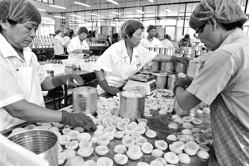 7月31日,山东枣庄市山亭区水泉镇一家外贸企业的员工在生产出口果品罐头。近年来,有着“鲁南果乡”美誉、林果面积达到11万亩的山东枣庄市山亭区水泉镇,将“果品+海外”战略的实施作为解决农民卖果难、拉长果业产业链条的一处重头戏,在推广标准化种植、确保果品质量的基础上,积极引进、扶持果品深加工外贸企业,大力开拓海外市场。目前,该镇年出口果品深加工产品3.5万余吨,产品远销欧美、中东、东南亚等近40个国家和地区。刘明祥 摄(cnsphoto供图)