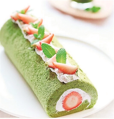 分离蛋黄蛋清,将蛋黄和油搅拌;抹茶粉加温水调开;将步骤2倒入步骤1中;搅拌均匀,筛入低粉,搅成蛋黄糊;蛋清中加入少量柠檬汁,低速打发成醋泡,分三次加入白糖打发至8成即可;取出1/3的蛋白,切拌手法加入蛋黄糊中;在倒回剩余2/3的蛋白中,快速搅匀避免消泡;裁好油纸,铺在烤盘上,将面糊倒入烤盘中,要有适当的高度;用刮板抹平,放入已经预热160度的烤箱,烘烤15分钟即可;烤好后,倒扣在铁网上放凉,在150克奶油中加入15克糖,打发奶油在蛋糕面上抹平;按顺序摆放草莓,轻轻卷起,稍稍用力握紧,直至卷成卷即可;最后在表面上装饰奶油的水果即可。