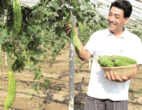 今年,江苏省东海县按照“人闲地不闲,一地两赚钱”的新思路,积极会同县域果蔬专业合作社,利用2万多亩蔬菜大棚夏闲晒地试点推广既是保健食品又是中药材的良种无公害苦瓜种植。无公害苦瓜经蔬菜合作社牵头,不出地头就被各地经纪人收购一空,每座大棚平均增收5000多元。图为社员正在采摘苦瓜。张正友 摄