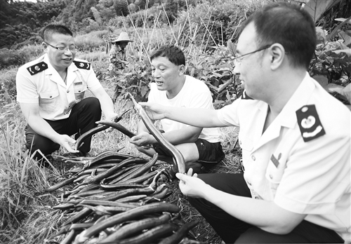 在落实农产品布局、发展农村经济、脱贫致富攻坚中,浙江省武义县涉农部门党员与农村基层党组织挂钩,实行一对一、心贴心服务,甘当农民增收致富的联系员、宣传员、推销员、服务员。图为8月15日,武义国税、农业等部门的党员来到南部山区新宅镇大莱村七彩梯田蔬菜专业合作社,田头与菜农落实品种布局、蔬菜销路等问题。