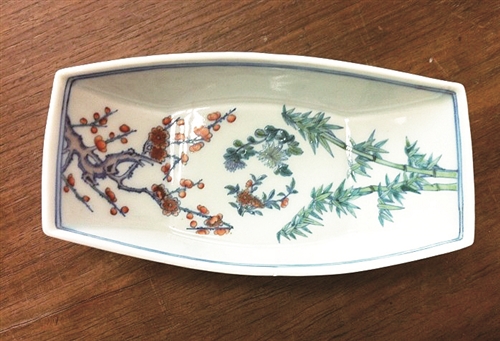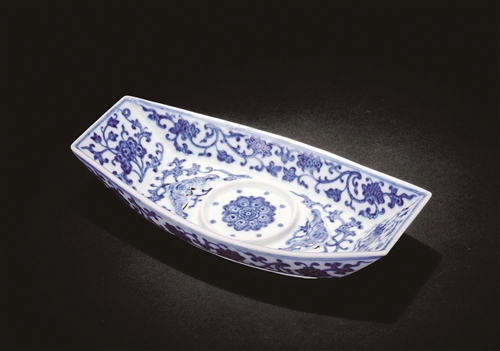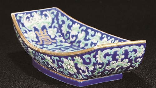 笔者收藏有四件旧茶船,有青花茶船、牛角茶船、斗彩茶船、蓝地粉彩茶船,认为古代茶船是当时实用器,遗成尚多,要收藏必须收藏到精品茶船。如一款青花茶船,青花发色特好,画工精细,胎釉都一流,乾隆本朝款,长16cm,宽8cm,全美品;此摆件茶船形,外以青花绘芦雁图,纹饰工整严谨,青花发色明艳。船弦上塑一乌龟,意欲爬出,形态逼真,栩栩如生。茶船整体高雅质朴,古色古香。另一款青花茶船内壁绘缠枝花卉,外壁绘八仙人物,纹饰工整严谨,青花发色明艳。整体高雅质朴。或一款“大清嘉庆年制”,矾红六字篆书款, 器物成船型,平底、浅圈足;白釉为底,内心绘洪福万字纹、外壁绘洪福衔磬,合为“万福宝庆”之意,色彩搭配艳丽。这种茶船甚是少见,值得收藏者关注。