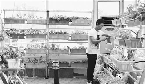 据了解,家庭智能菜园技术采取的是无土栽培,以树木的碎屑和根底为基质,作为植物或蔬菜所需要的底肥,用人工配制的营养液来为植物整个生命周期提供营养。采用滴灌系统,无须人工浇水,自带的LED灯可以根据光照和位置的不同,自动补光。该技术将菜园搬进了居民家的阳台、客厅、卧室、或办公室等地,一年四季皆可种植。图为8月22日,工作人员在智能菜园里察看蔬菜长势。冬生 摄 (cnsphoto供图)