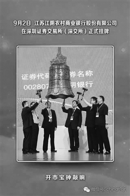 本报讯 9月2日,深圳证券交易所,无锡市委常委、江阴市委书记陈金虎,江西省农村信用社联合社理事长吴万善,江苏江阴农村商业银行股份有限公司董事长孙伟和部分大股东共同敲响了开市宝钟,江苏江阴农村商业银行股份有限公司股票“江阴银行”成功登陆深交所中小板市场。