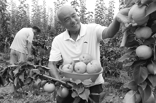 在河南省郏县白庙乡下叶村的果园里 ,果农叶保安正满怀喜悦地采摘黄金梨。两年前,叶保安在郏县农村信用合作联社的扶持下,建起了占地30亩的果园 ,并引进了优良品种黄金梨。他采取无公害种植,不上化肥,所产黄金梨个大、味甜、含糖量高,吸引了市区的市民自助采摘。刘晓辉 王 阳 摄