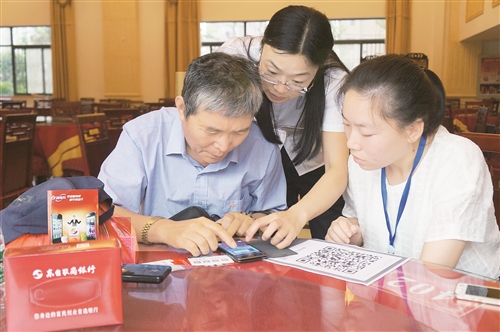 为深入推进金融服务的质效提升,促进现代化支付结算工具在全社会的推广普及,江苏东台农村商业银行发动员工利用休息时间,深入社区,面对面辅导客户使用手机银行、微信银行等“掌上银行”。图为该行员工对中老年客户不厌其烦,详细讲解手机银行的使用方法。吴海兵 张明华 摄
