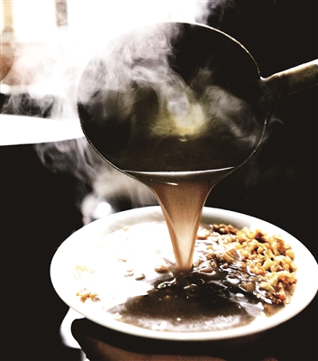 在当地朋友的带领下,我们走进了一户院舍整洁的人家。主人憨厚淳朴,话不多,见人只是微微一笑。他已知我们的来意,说:让掌柜的做给你们吧。同行者和主人在院子里开始闲聊吃茶,吃的是本地毛尖茶,我去厨房里看她做面茶。第一道工序,是炒调料——她把这个繁琐的过程称为“炒调和”,即用清油、精盐、葱花依次炒完鸡蛋、豆腐、切碎去皮的核桃仁以及小麦面粉。她告诉我,“调和”是一碗好面茶的基础,鸡蛋要炒得嫩,豆腐丁要炒成金黄色,核桃仁要炒得脆,面粉要炒得熟。炒好“调和”,在案板的另一侧置一大一小两只陶罐,她先在小罐中用清油、盐将茶叶炒熟后加水煮茶,又在大陶罐中以红葱皮、花椒叶、茴香秆、生姜片为底料,加水,及沸,复将刚才炒熟的麦面粉加入一勺,再将小罐内的茶水注入,用竹筷边搅边煮,四五分钟后,滤出面茶流汁,盛入小碗,依次将备好的油锅渣、豆腐丁、核桃仁、鸡蛋等“调和”适量置入。