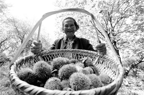 9月27日,江西省东乡县瑶圩乡马岭村的山野林间栗果飘香,该村的700亩板栗进入采摘期。近年来,东乡县大力推进生态经济林建设,全县发展种植的5万余亩桃、梨、杨梅、板粟、枇杷等特色经济林成为农民致富的“绿色银行”。