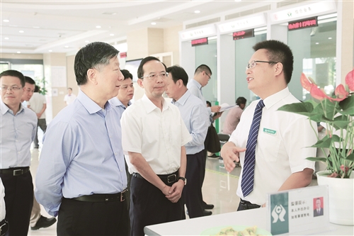 9月22日,中国银行业监督管理委员会主席尚福林(左一)、副主席曹宇到江西新建农村商业银行调研工作。尚福林一行详细了解了新建农商银行小微贷、续贷保等特色产品,视察了该行金融消费者权益保护站创建情况,听取了该行员工成功拦截电信诈骗案例,对该行特色普惠金融工作表示赞许。