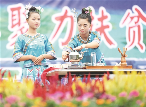 10月1日,广西三江侗族自治县“文化洋溪聚力扶贫暨平安建设”文艺汇报演出在该县县城上演,当地群众以茶艺表演、芦笙踩堂、侗族大歌、民俗歌舞等多彩节目,为过往游客献上一场精彩绝伦的文化视听盛宴,使侗乡国庆倍添风韵。龚普康 摄