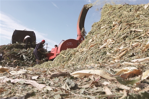 9月26日,在山东省临沂市平邑县地方镇小广良村腾龙肉牛养殖场,农户将玉米秸秆粉碎青贮。近年来,平邑县把推进秸秆饲料化与调整畜禽养殖结构结合起来,大力推广玉米秸秆直接粉碎饲喂、秸秆微生物发酵、秸秆氨化等技术,扶持养殖户建设青贮池,引导养殖企业、养殖户与农户签订秸秆利用合同,让玉米秸变废为宝成为畜禽饲料,不仅促进了玉米秸秆的转化利用,增加了玉米种植户的收入,也为发展畜禽养殖提供了充足的饲草,降低了养殖户的成本。
