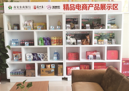 图为南安农商银行金街社区银行“精品电商展示区”及实物造型。