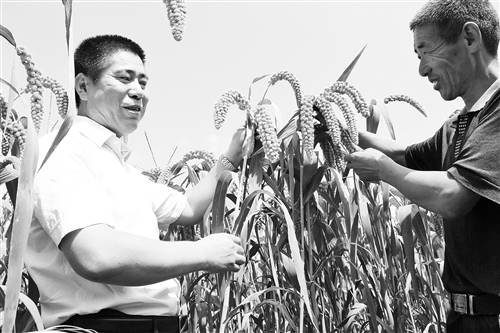 山西省原平市农村信用合作联社加大支农力度,运用信贷资金引导农民调整种植结构,实现粮食高产,农业效益最大化。图为原平联社白石信用社客户经理深入贾庄村田间地头,与村支部书记共同研究调整农业种植结构,走旱作农业新型之路,引导小杂粮生产向规模化发展。