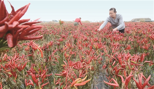 辽宁省凌海市双羊镇望天椒专业生产合作社携手加工企业实行订单生产,解除了椒农的后顾之忧。据技术人员测产,平均亩产量达300公斤。由于订单种植,椒农不再发愁销售问题,按目前的收购价计算,平均亩收入在4000元以上。图为10月22日,位于育新村的万亩无公害望天椒种植基地正在收获。李铁成 摄