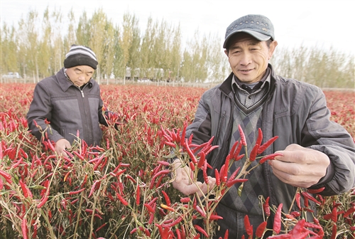 近年来,新疆生产建设兵团第五师八十九团不断加大农业结构调整,鼓励农民发展特色种植。农民刘成海采用膜下滴管新技术种植“三樱椒”145亩,预计每亩产量可达500公斤左右,亩收入五千余元。图为博乐市贝林哈日莫墩乡的农民在刘成海的辣椒地里观摩学习辣椒种植技术。