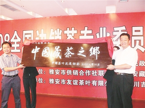 2008年,中国茶叶流通协会授予雅安市“中国藏茶之乡”称号。6月,国务院发文将“南路边茶制作技艺”列入国家级非物质文化遗产名录,8家企业成为保护单位。全国黑茶有湖南益阳、安化同时入选,四川独此一家。9月,全国边销茶工作会议在雅安召开;10月,“川茶情深,感恩中国”系列活动在北京举行。