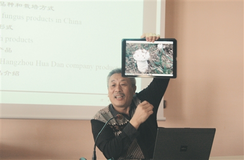 韩省华以《中国菌类产品与人类健康》为题,向中意双方参会代表介绍了我国食用菌产业的发展情况。他说:“如今,食用菌已经成为仅次于粮、棉、油、菜、果的第六大类农产品。根据相关数据显示,2008年-2014年中国食用菌产量平均每年增产约192万吨。食用菌产品形式有鲜品,干品,速冻品、真空冷冻干燥产品,腌渍产品,休闲食品以及利用生物技术提取菌类有效成分开发出的科技产品等。通过农户、合作社、企业等组织形式,人工栽培的食用菌实现商品化36种,实验室栽培成功60种。”他还特别介绍了通过技术创新而风靡养生圈的灵芝孢子破壁粉的药用功效,引起了与会代表的极大兴趣。