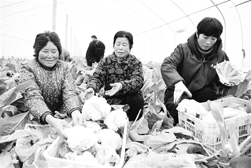 初冬时节,安徽省亳州市涡阳县孙家蔬菜种植专业合作社种植的40多亩有机花菜喜获丰收。据菜农介绍,由于有机花菜无公害、质量好,市场上备受市民们的青睐。花菜远销河南、山东,安徽周边县市等地,亩均收入在1万元以上,有机花菜种植成为当地农民增收致富的好门路。图为11月25日,在涡阳县扶贫开发示范基地城西街道办事处潘寨村孙家蔬菜种植专业合作社,工人正在温室大棚里忙着采收有机花菜,准备上市销售。刘勤利 摄(cnsphoto供图)
