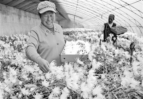 11月30日,河北省秦皇岛市海港区海阳镇茂源果蔬合作社成员采摘食用菊花。近年来,海港区海阳镇茂源果蔬合作社不断探求新特产品,并在2015年从农科院引进9个品种食用菊花在合作社基地内种植,准备将食用菊花打造成为生态农家乐、旅游观赏为一体的特色品牌,目前已成活15000余株,预计每亩年收入5万余元。曹建雄 摄(cnsphoto 供图)