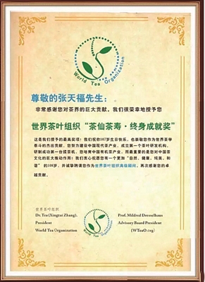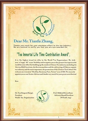 聘任书原文件写道:“尊敬的张天福先生:非常感谢您对茶界的巨大贡献,我们也很荣幸授予您世界茶叶组织茶仙茶寿终身成就奖,这是我们授予的最高奖项。我们祝您107岁生日快乐,也崇敬您作为世界茶界泰斗的杰出贡献,您努力建设中国近代茶产业,成立第一个茶叶研发机构,成功研制第一台揉茶机,您培育中国有机茶产业,而最重要的是您对中国茶文化的贡献巨大,我们衷心祝愿您有一个更加自然、健康、纯美、和谐的108岁,并诚挚邀请您成为世界茶叶组织的高级顾问,再次感谢您的卓越贡献!”