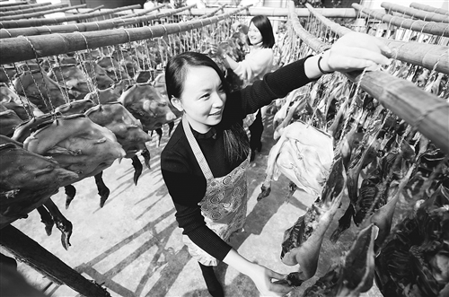 12月7日,江西万年县苏桥乡合作社社员在翻晒板鸭。为做大做强板鸭业经济,苏桥乡组建板鸭生产专业合作社,以品种更新和无公害标准化生产加工为关键点,以培育企业核心竞争力为突破口,采取“公司+农户”的模式生产,大力发展科技鸭业、生态鸭业、文化鸭业。目前,无公害或绿色生态鸭产品占总产值的比重达80%以上,产品远销北京、上海、湖南、福建等多地,实现产值5000多万元,带动1500多户农户致富。
