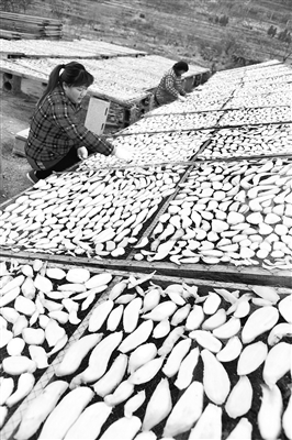 近日,山东省枣庄市山亭区连续出现艳阳高照的好天气,当地许多农民抓住这一好时机,晾晒粉皮、地瓜干等农副产品,一派繁忙景象。图为12月11日,柴山前村妇女在晾晒地瓜干。刘明祥 摄(cnsphoto供图)