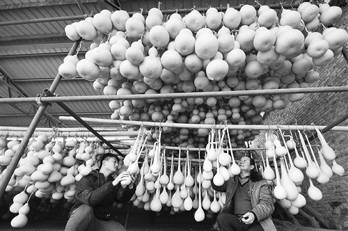 1月4日,山西运城市盐湖区龙居镇西袁庄村运宝葫芦专业合作社首次引进的百亩特产葫芦喜获大丰收,社员们加紧为山东、河北等地客户挑选、悬挂、晾晒,准备外销。据悉,2016年首次引进种植可做酒壶等容器、葫芦箫等乐器、工艺美术品的特色特产葫芦一次成功,被河北、山东等地客商全部订单收购,百亩葫芦创收近300万元,成为村民稳定增收又一新型产业。
