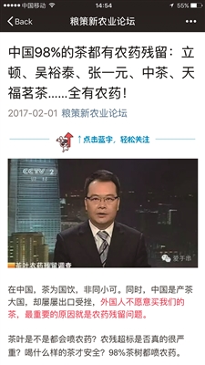 2月1日,一条来自微信公众号粮策新农业论坛的文章《中国98%的茶都有农药残留:立顿、吴裕泰、张一元、中茶、天福茗茶……全有农药!》的文章,因转发范围广,引来众多消费者关注。有的读者直接致电茶周刊记者,询问消息的可靠性。后经分析得知,该文章所写内容大部分为作者断章取义地从网上摘选文字,拼凑而成,还请消费者理性对待。