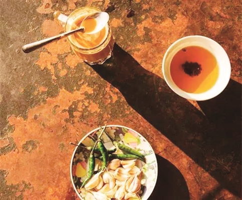 将发酵好的茶叶与卷心菜、蒜末、小米椒、花生、蚕豆等拌在一起,味道极为丰富而富有层次,集苦、酸、辣、香、咸于一身,是缅甸人最爱的小食之一。这道菜百搭,它既可以是一道小吃,一碟开胃菜,也可以和一盘米饭搭配在一起成为一顿饭。